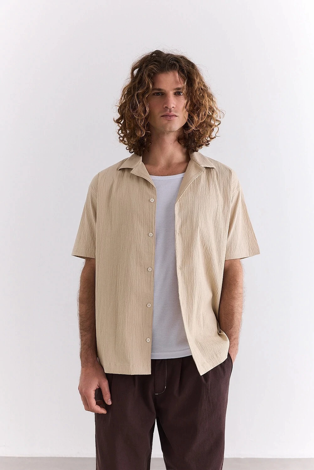 Camisa manga curta com gola cubana e modelagem boxy levemente mais curta no comprimento.