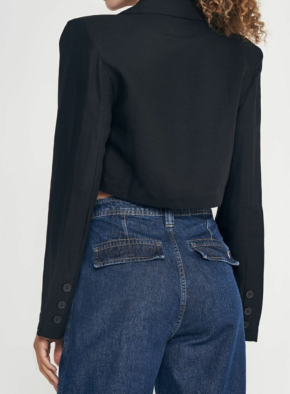 Detalhes: O comprimento cropped e a gola tradicional são os grandes destaques do blazer, conferindo um visual moderno e ao mesmo tempo atemporal. Os botões frontais e os bolsos laterais adicionam um toque clássico e funcional. A cor preta versátil torna a peça fácil de combinar com as mais diversas propostas.