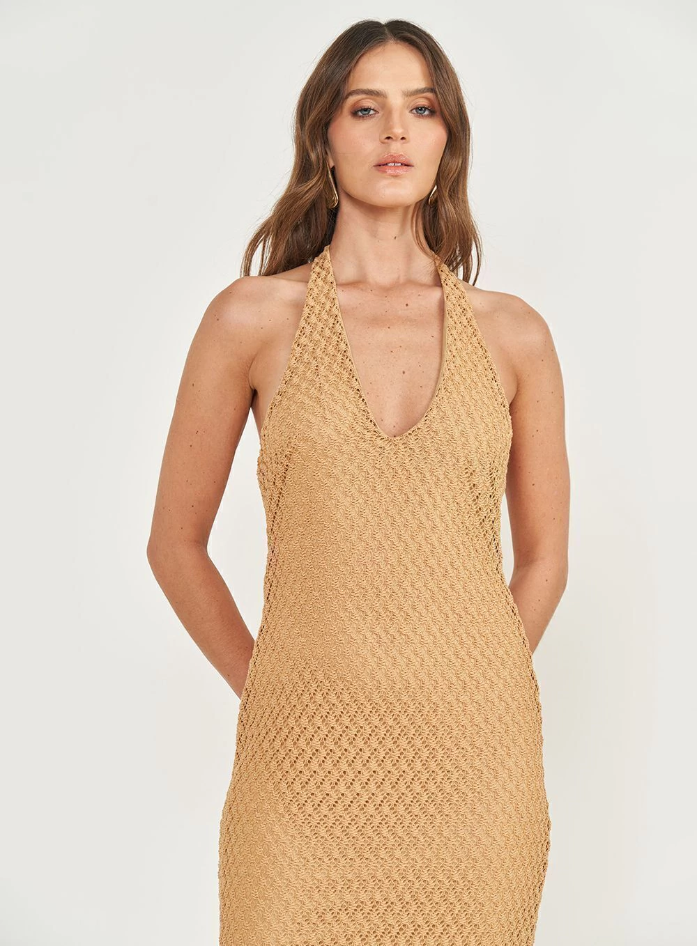 Design: Apresenta uma modelagem sereia que abraça elegantemente a silhueta até os joelhos, abrindo-se suavemente até o comprimento midi, criando um movimento fluído e feminino. O decote em V profundo na parte frontal e o design frente única (halter neck) valorizam o colo e os ombros, adicionando um toque de sensualidade sofisticada e frescor. As costas são amplamente abertas, revelando a pele com elegância.