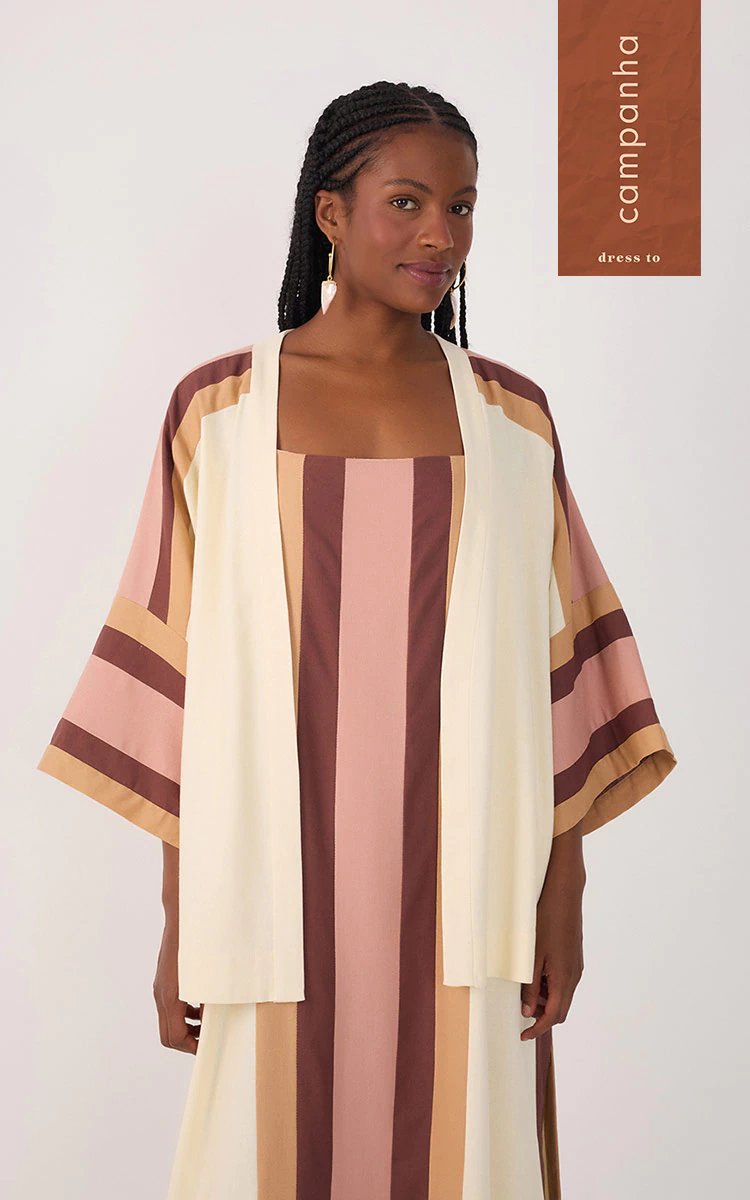 Aquela sobreposição que faz toda a diferença no look. O kimono recortes é produzido em linho, possui comprimento alongado, mangas soltinhas, shape amplo e bordado de sol todo charmosinho nas costas.