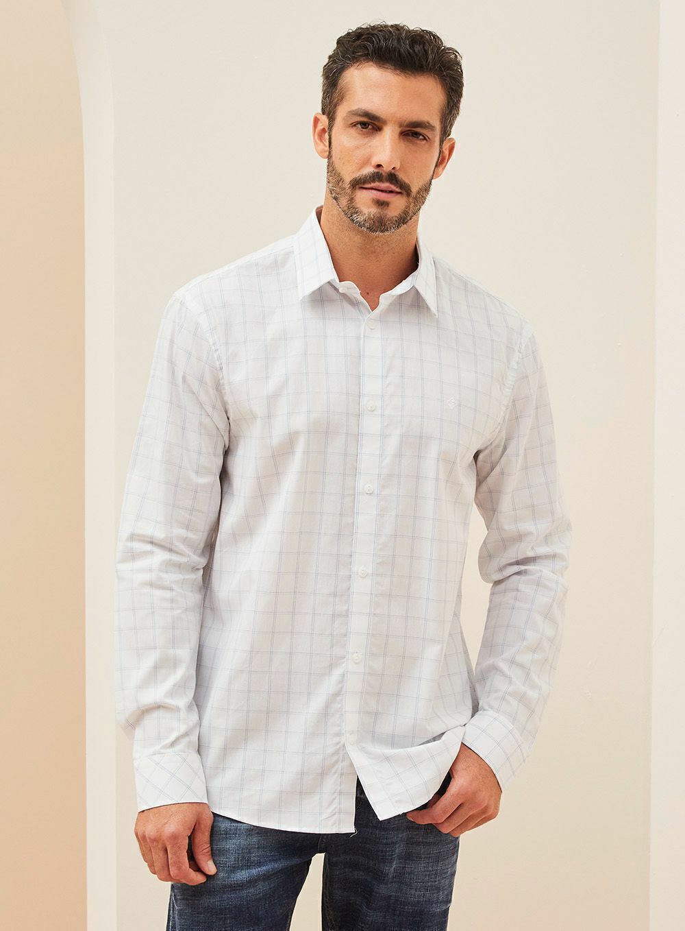 Confeccionada em 100% algodão de alta qualidade (tricoline), esta camisa oferece um toque suave, leveza e excelente respirabilidade, perfeita para a primavera. Seu corte Relax proporciona um caimento confortável e elegante. O clássico padrão xadrez janela em linhas finas Azul Celeste sobre o fundo branco confere um visual atemporal e sofisticado. Detalhes como os botões perolados e o discreto logo FORUM bordado no peito complementam o design, refletindo a atenção aos detalhes da marca e a proposta de harmonia da coleção Urban Breeze.