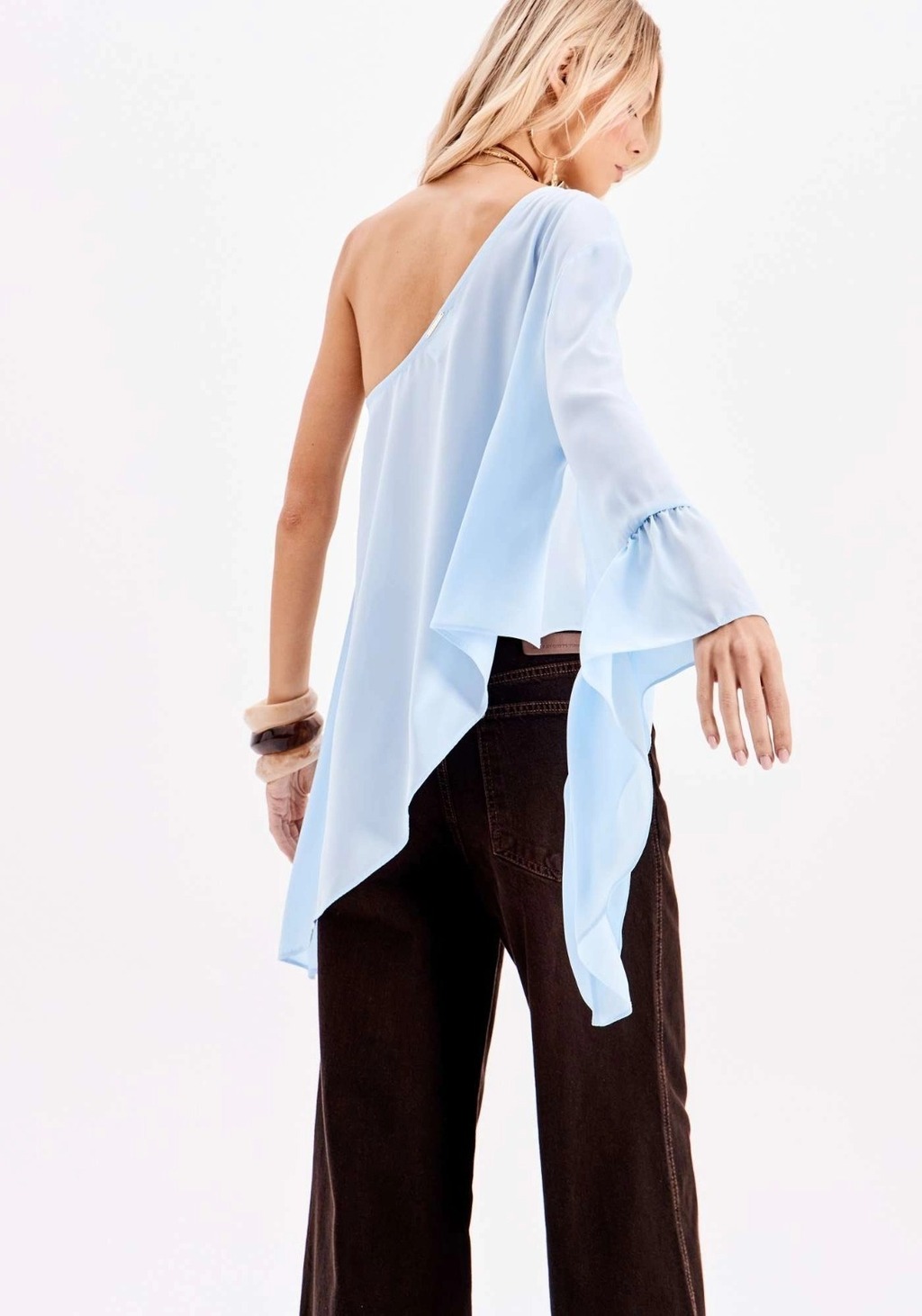 Aposte na blusa alongada com estilo assimétrico, com design de um ombro só e manga ampla com leve franzido. Possui caimento fluido e toque leve, ideal para produções autênticas com conforto e movimento.