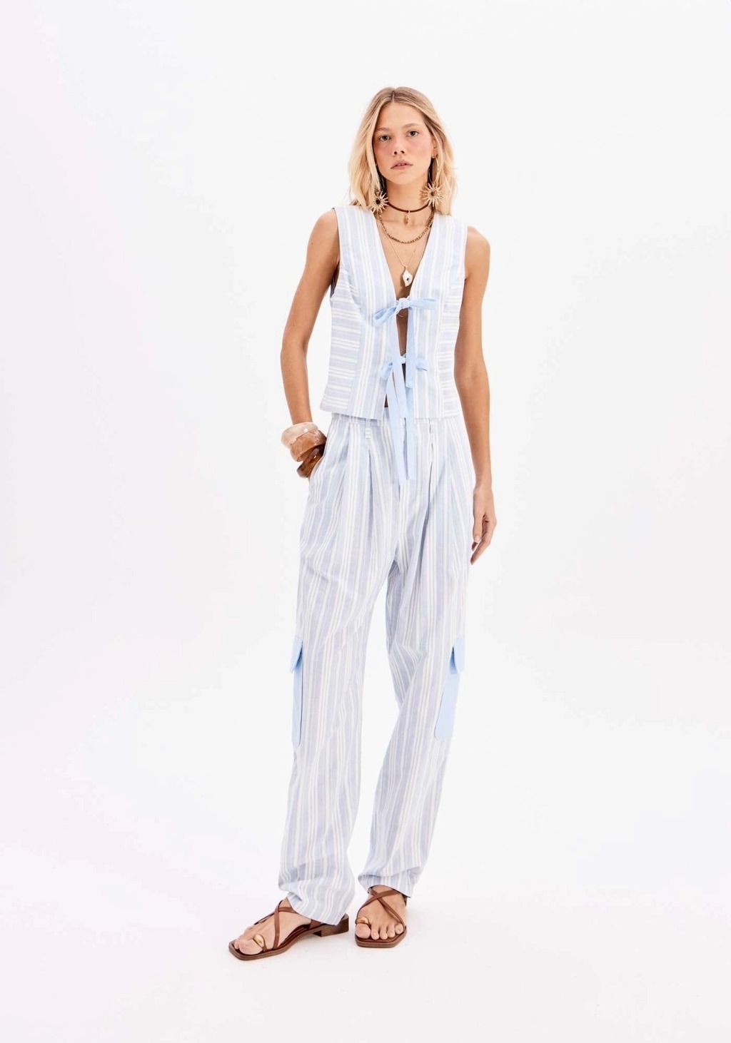 o colete sem mangas com estampa listrada e fechamento por amarrações frontais é a peça must-have da estação. Possui caimento descolado e tecido confortável, ideal para sobreposições ou uso solo.