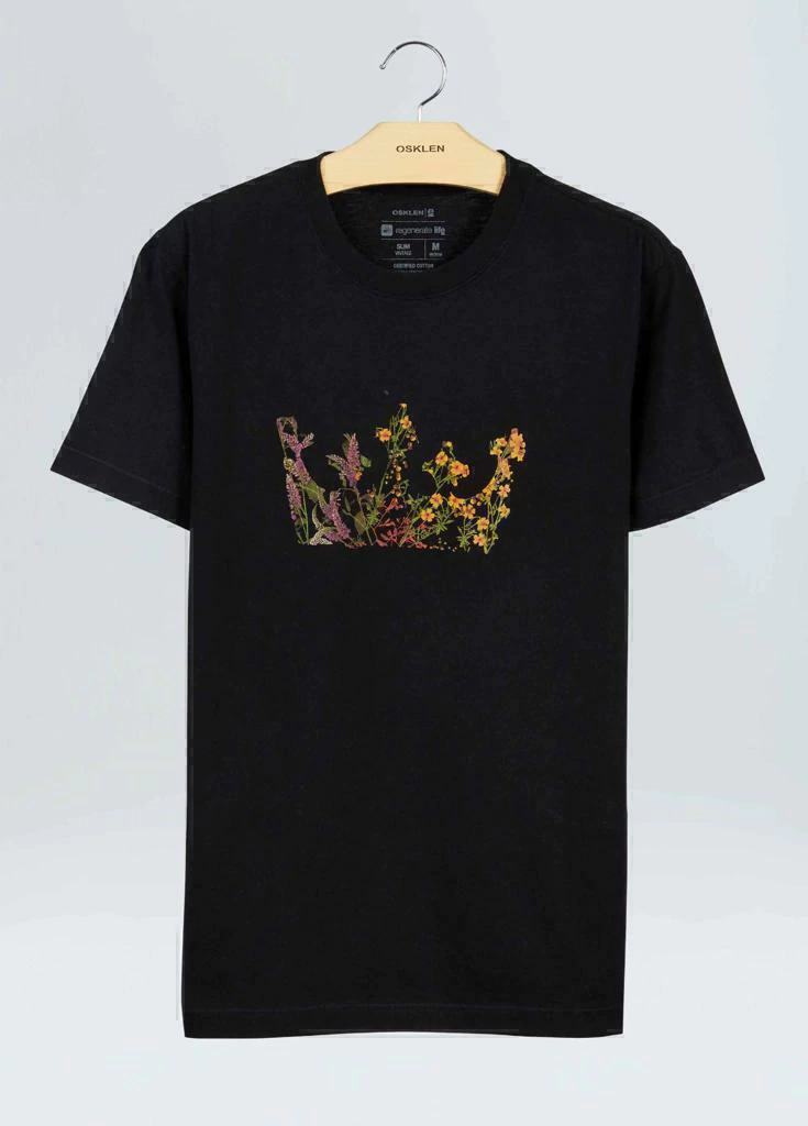 T-shirt masculina 1/2 malha 100% algodão certificado, base de modelagem Slim. Bandeira Regenerate Life. A produção do algodão nacional certificado contribui para redução dos impactos ambientais, utiliza energia renovável, reduz o consumo de água e fomenta o aprimoramento social e ambiental das cadeias produtivas brasileiras.