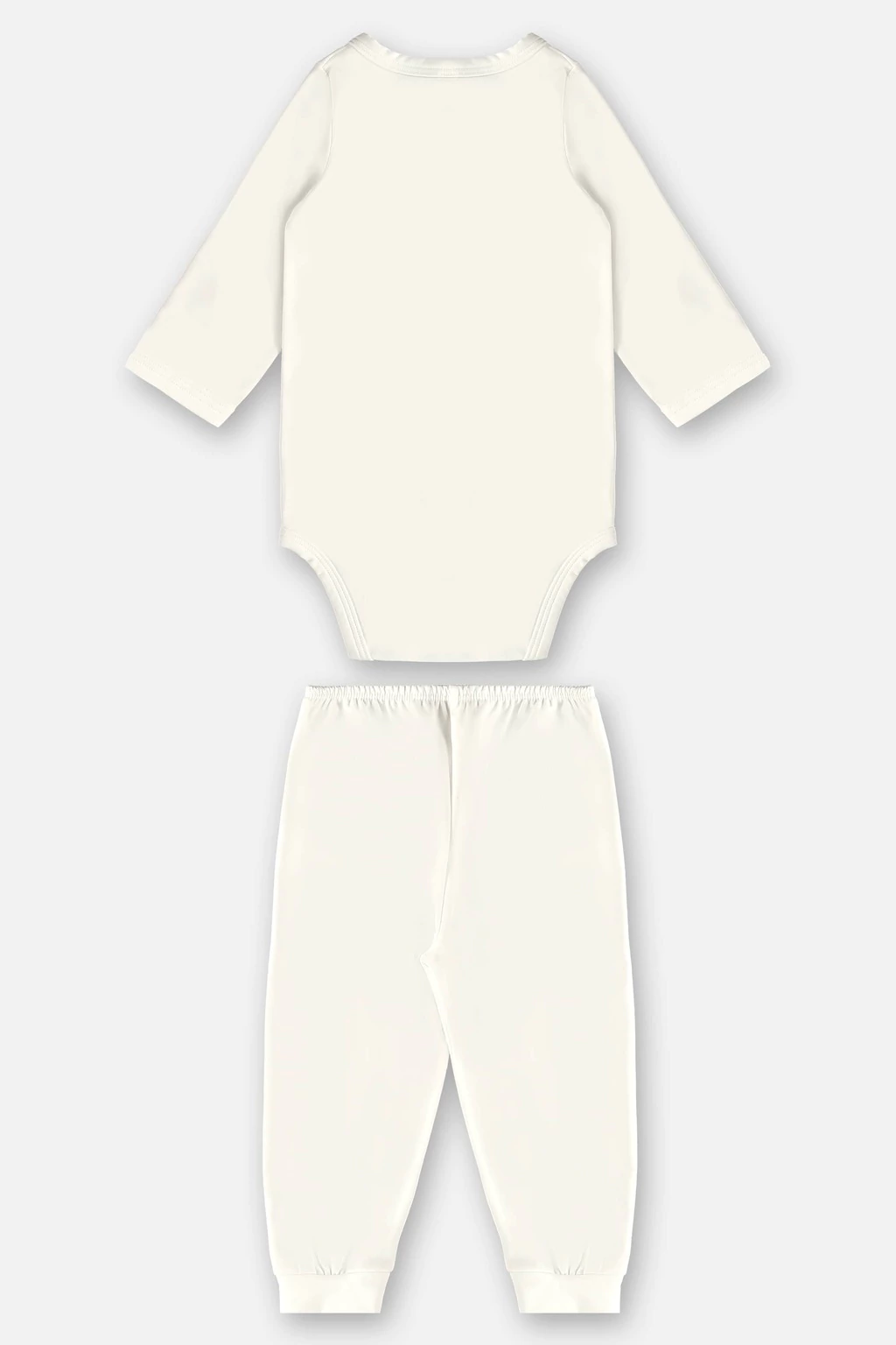 Conjunto para bebê unissex, composto por um body e uma calça em malha térmica.